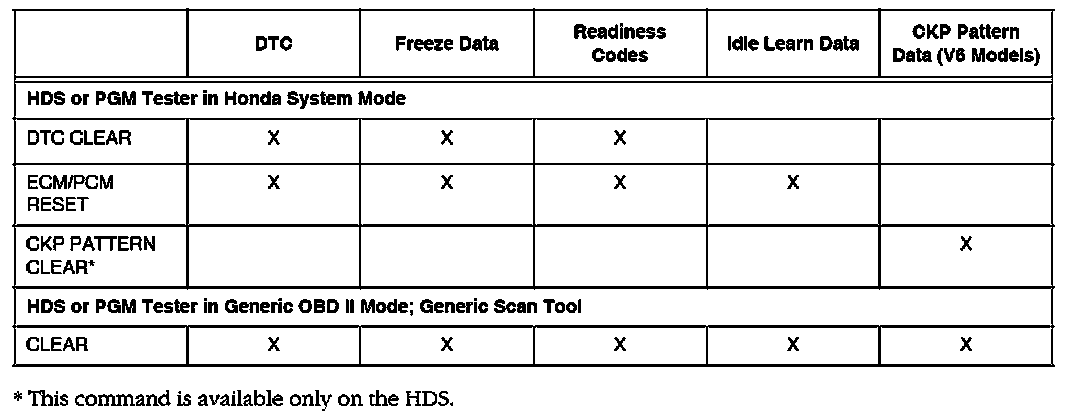 American Honda has supplied two different scan tools to Honda dealerships. The first to come out was the PGM Tester. It services all '92-03 Honda vehicles but it's no longer supported by American Honda. The latest evolution is the Honda Diagnostic System (HDS). It's the PGM Tester's replacement and it services all current Honda models as well as the older ones. The HDS, like the earlier PGM Tester, features a Generic OBD II mode. In this mode, the HDS works the same as any aftermarket scan tool. A Generic OBD II scan tool must be able to display DTCs and to clear them. If you try to clear DTCs on a Honda vehicle using the HDS or PGM Tester in Generic OBD II mode or a generic scan tool, you might not get the results you'd expect. That's because Honda vehicles actually use three different kinds of clear commands: DTC CLEAR, ECM/PCM RESET, and more recently, CKP PATTERN CLEAR. If you're using the HDS or PGM Tester in Honda System mode, the level of clearance varies. If you're using the HDS or PGM Tester in Generic OBD II mode or a generic scan tool, there's just one clear command. It clears all learned values.