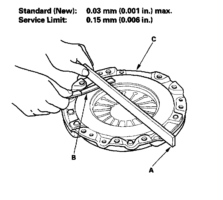 Inspect for warpage using a straight edge (A) and feeler gauge (B). Measure across the pressure plate (C). If the warpage is more than the service limit, replace the pressure plate