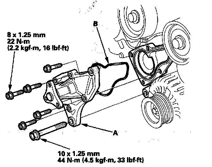 Install the water pump (A) by installing the six bolts.