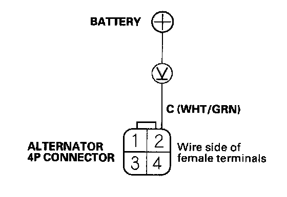 4. Measure the voltage between the alternator 4P connector terminal No. 2 and the positive terminal of the battery.