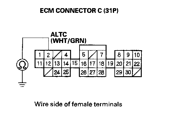 7. Check for continuity between the ECM connector C terminal No. 2 and body ground.