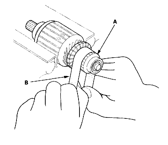 20. Hold the planetary gear shaft (A), and turn the overrunning clutch assembly (B) both ways. If it does not lock in either direction or it locks in both directions, replace it.