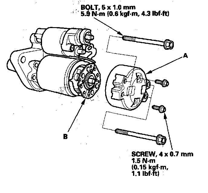 18. Install the starter end cover (A) to retain the brush holder (B).