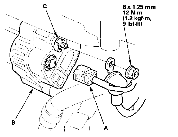 5. Disconnect the 4P connector (A) from the alternator (B), and disconnect the BLK wire from the alternator B terminal (C).