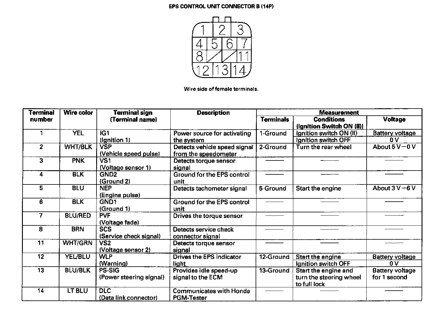 EPS Control Unit Inputs and Outputs for Connector B (14P)