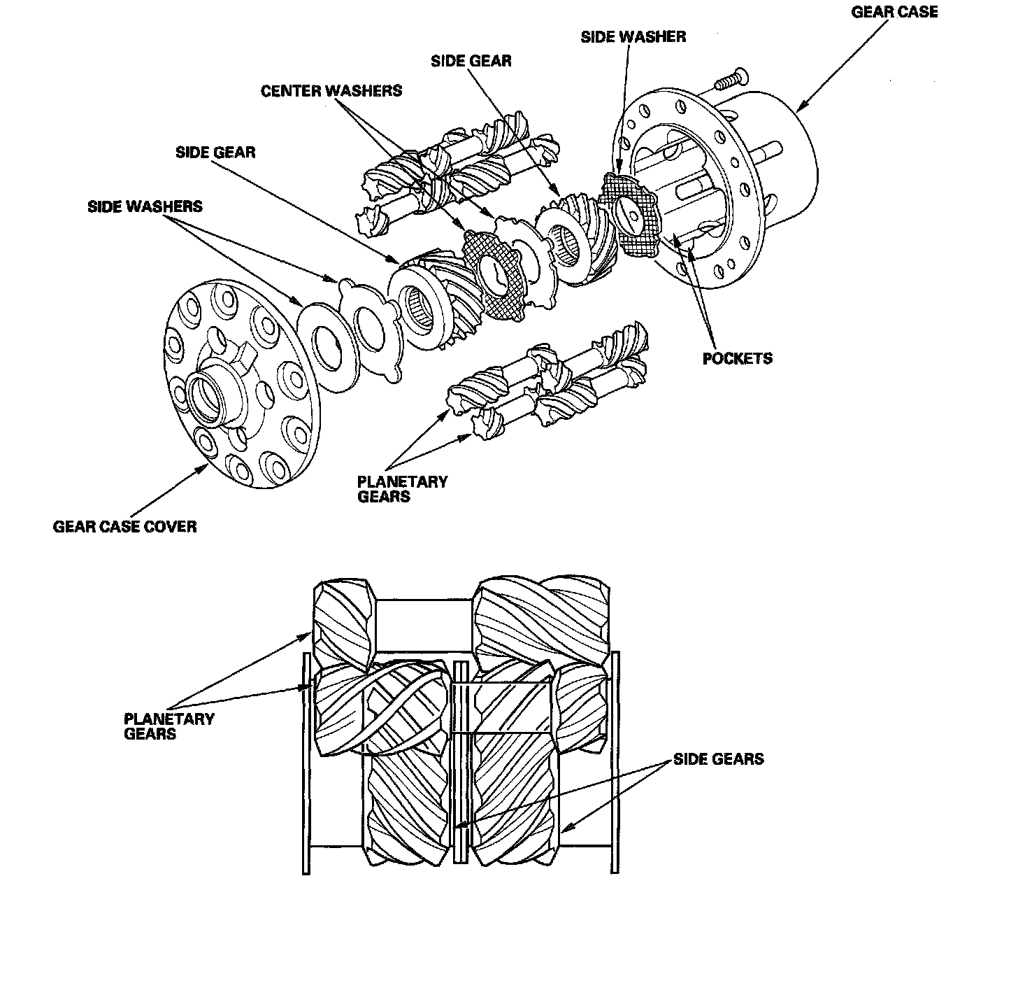 ^ The Torsen type LSD assembly consists of the two side gears, eight planetary gears, three side washers, two center washers, a gear case cover and a gear case.