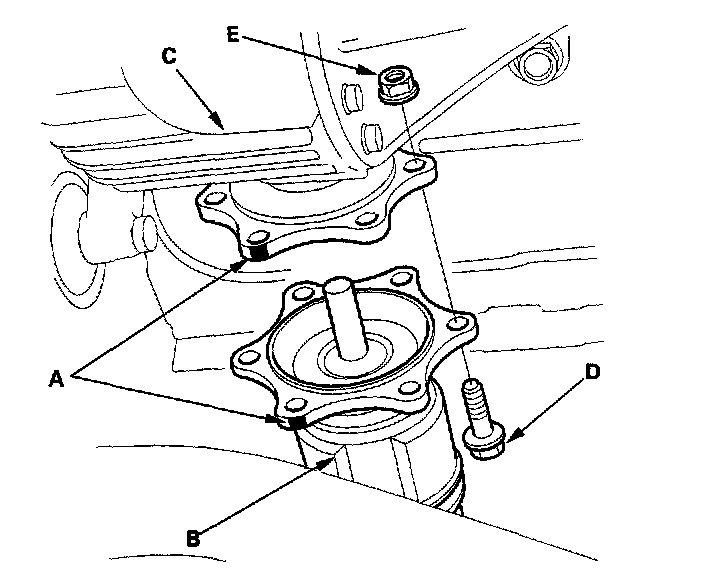 6. Remove the six inboard joint mounting bolts (D) and nuts (E), then remove the inboard joint from the rear differential.