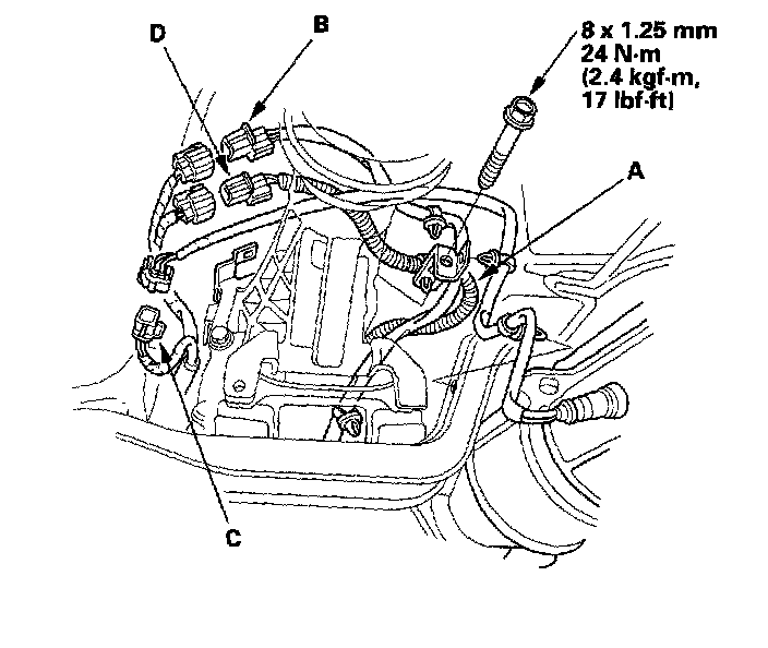 18. Install the wire harness (A) onto the transmission, then connect the Heated Oxygen Sensor (HO2S) (B), Secondary Heated Oxygen Sensor (Secondary HO2S) (C), and the back-up light switch (D) connectors.