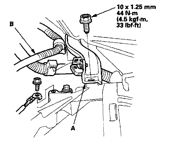 19. Install the intake manifold bracket (A) lower mounting bolt, then install the wire harness (B) on the intake manifold bracket.