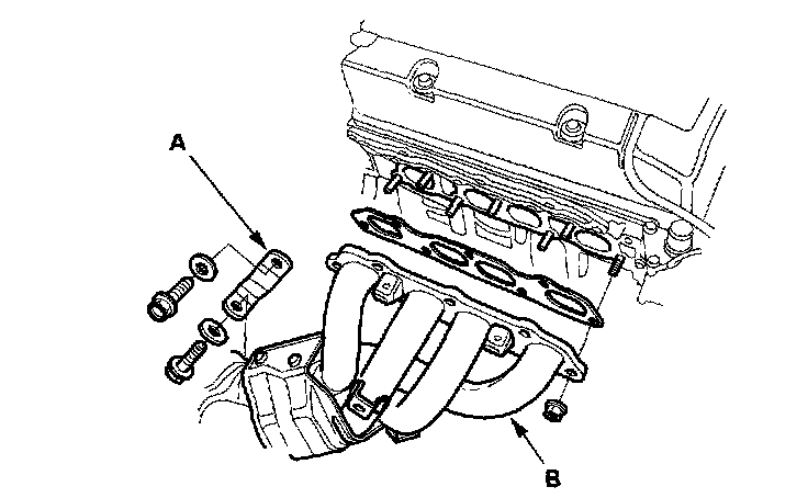 21. Remove the exhaust manifold bracket (A) and the exhaust manifold (B).