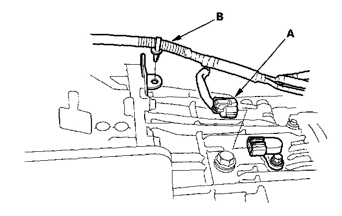 32. Lower the transmission. Disconnect the pickup sensor connector (A), then remove the wire harness (B) from the transmission.