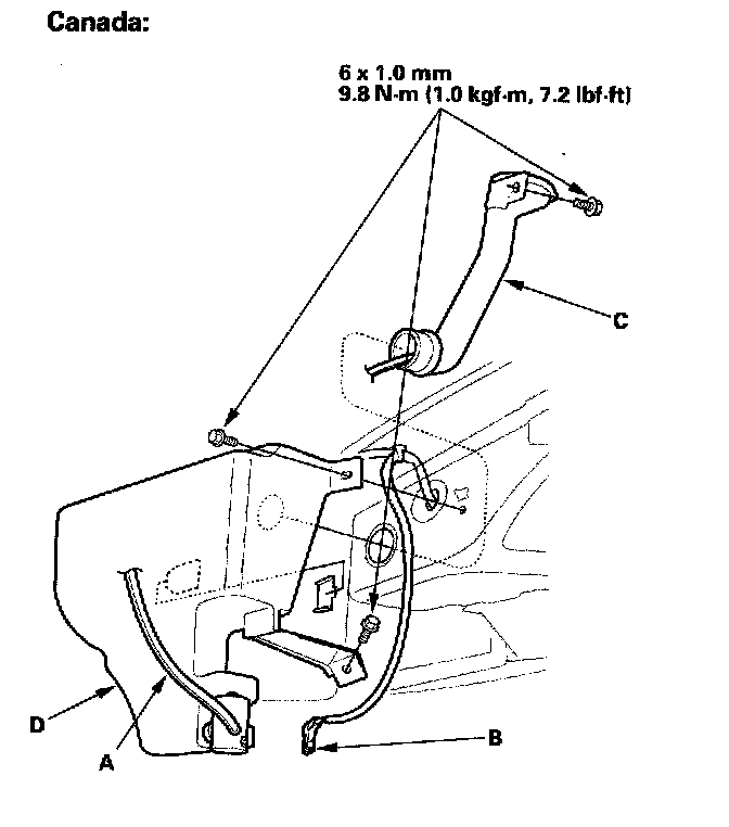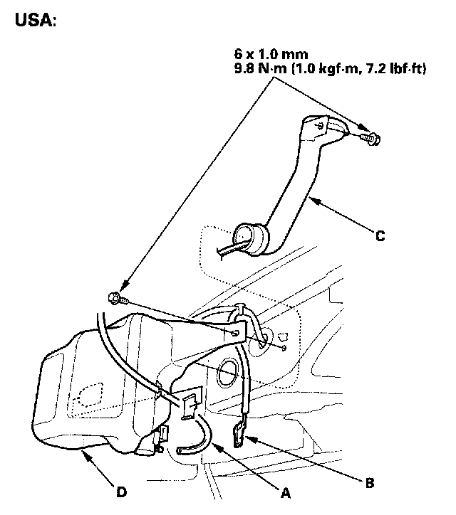 3. Remove the bolts, then separate and remove the filler neck (C) from the washer reservoir (D).