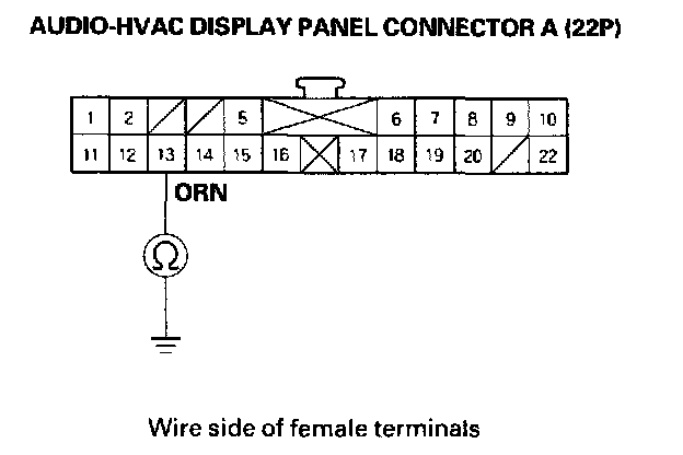 7. Check for continuity between the No.13 terminal of audio-HVAC display panel connector A (22P) and body ground.