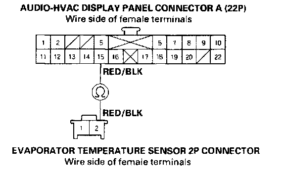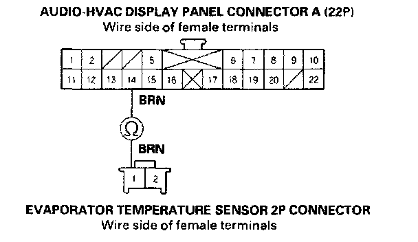 7. Check for continuity between the No.14 terminal of audio-HVAC display panel connector A (22P) and the No.1 terminal of the evaporator temperature sensor 2P connector.