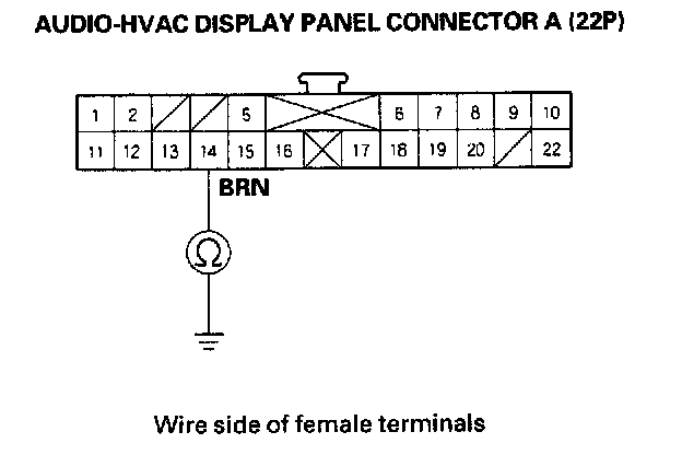 8. Check for continuity between the No.14 terminal of audio-HVAC display panel connector A (22P) and body ground.