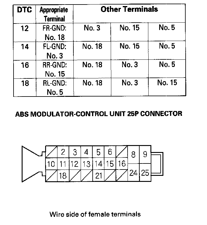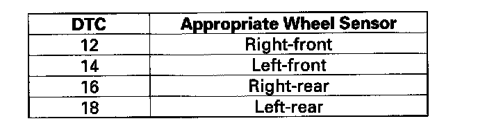 DTC 12, 14, 16, 18: Wheel Sensor (Electrical Noise/Intermittent Interruption)NOTE: If the ABS indicator comes on because of electrical noise, the indicator will go off when you drive the vehicle over 19 mph (30 km/h) and the noise is gone.