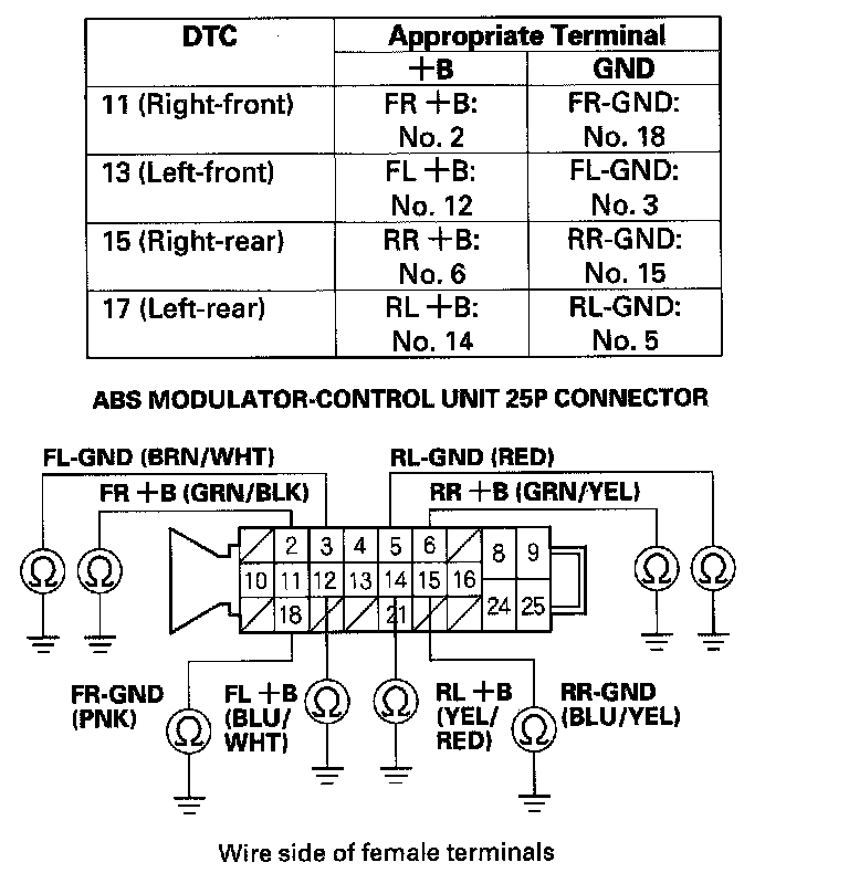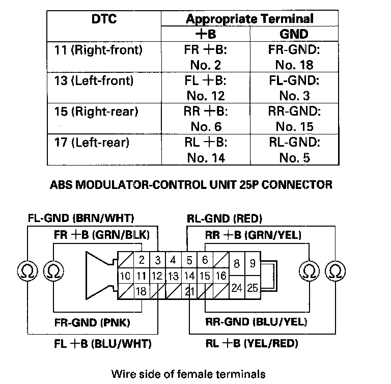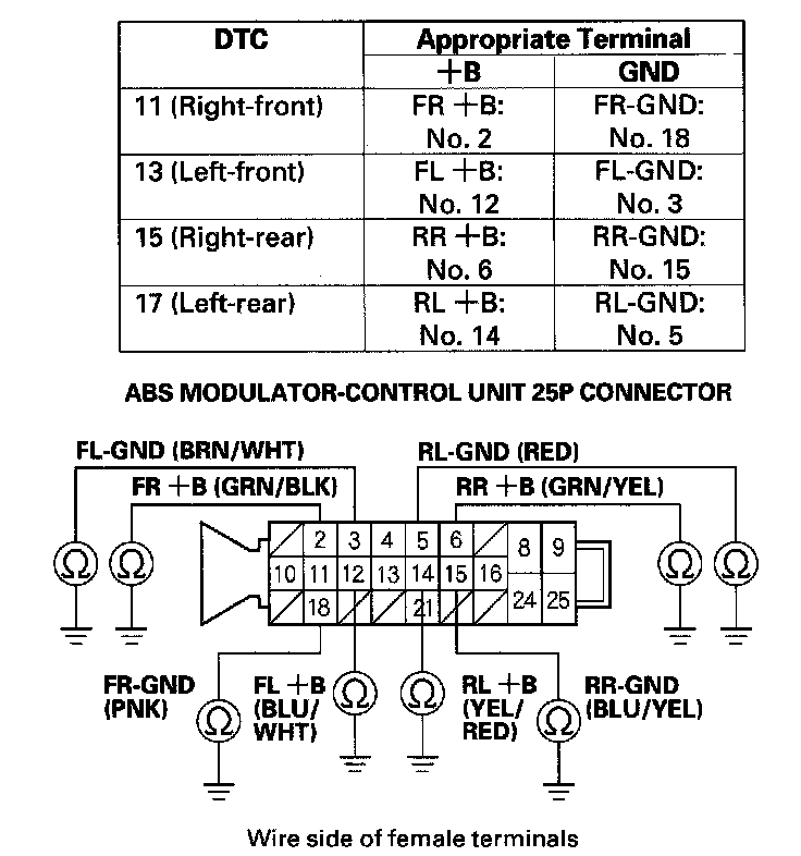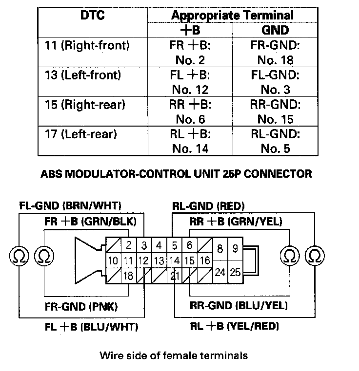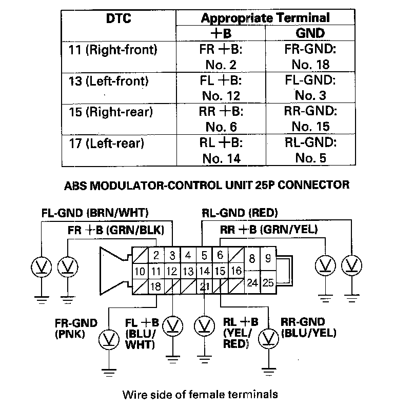 12. Check for continuity between the appropriate wheel sensor +B and GND terminals of the ABS modulator-control unit 25P connector (see table), then check for continuity between the same terminals and reverse the positive and negative tester probes.