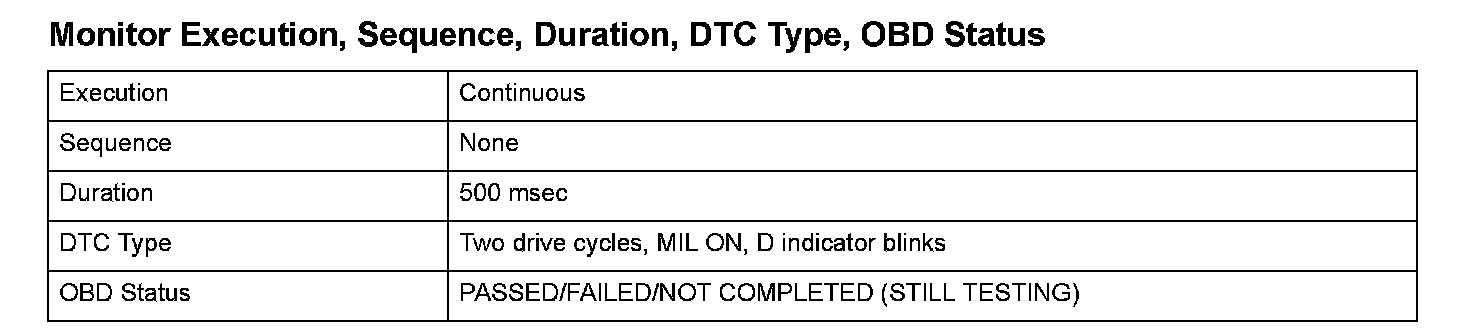 Monitor Execution, Sequence, Duration, DTC Type, OBD Status