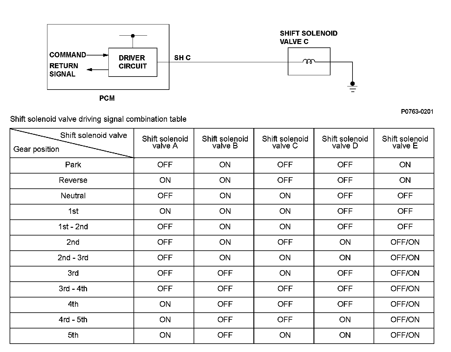 When shift solenoid valves A, B, C, D, and E are turned ON, the hydraulic pressure circuit opens. The hydraulic pressure circuit supplies/discharges hydraulic pressure to/from each clutch according to the combination of the ON/OFF status of those valves and the shift valves. The powertrain control module (PCM) commands the driver circuit to turn on the shift solenoid valve. The circuit diagnoses malfunctions such as a circuit short or open, and sends back a return signal during the PCM's command. When the return signal does not match the PCM command, a malfunction is detected by the PCM. The malfunction is detected when the return signal does not match the PCM command to turn ON the shift solenoid valve, and a DTC is stored.