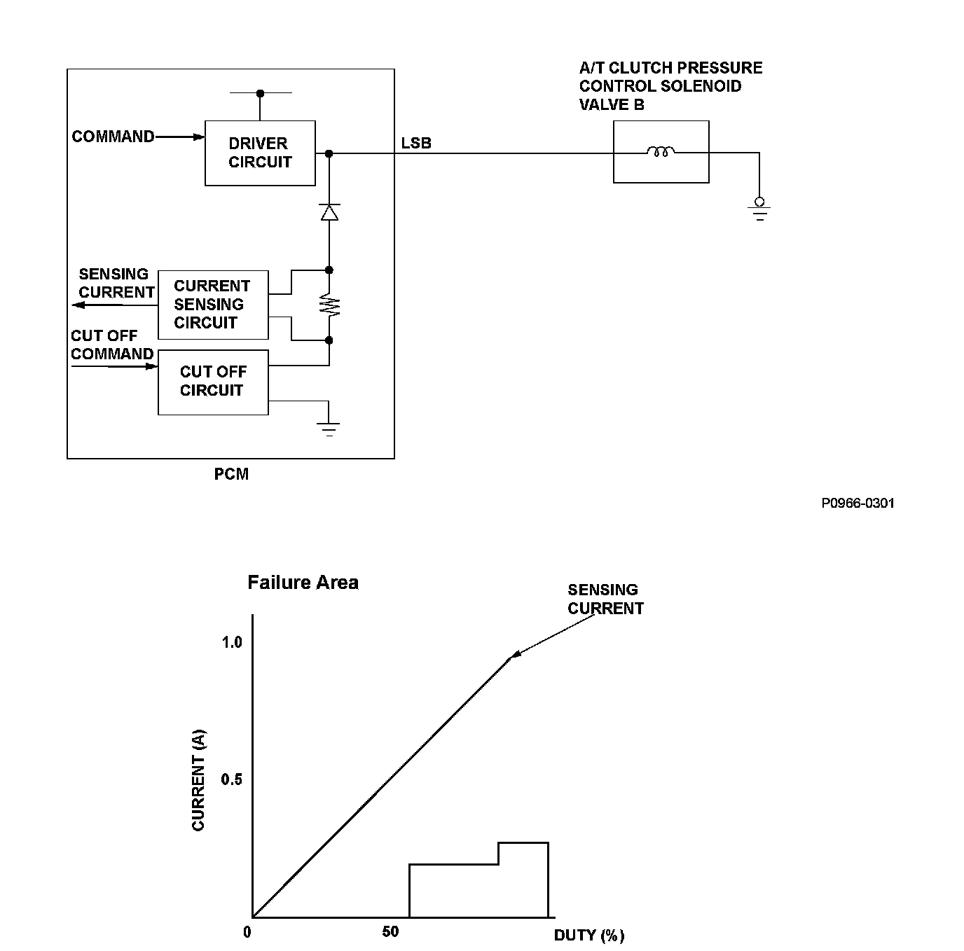 A/T clutch pressure control solenoid valve B is used for clutch pressure control. A spool in A/T clutch pressure control solenoid valve B pushes a valve according to the duty cycle that is controlled by the powertrain control module (PCM) to pressurize fluid so the hydraulic pressure is proportional to the current. The PCM measures the current flowing through A/T clutch pressure control solenoid valve B and uses feedback control to compensate the difference between the actual current and the commanded one. If the measured current for the PCM output duty cycle is not within a specified range (open or short), a malfunction is detected and a DTC is stored.