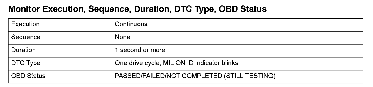 Monitor Execution, Sequence, Duration, DTC Type, OBD Status
