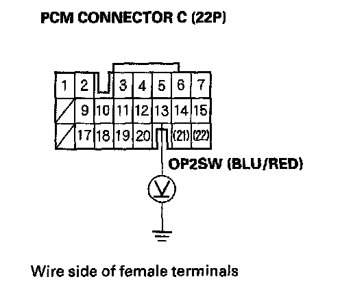12. Measure voltage between PCM connector terminal C13 and body ground.