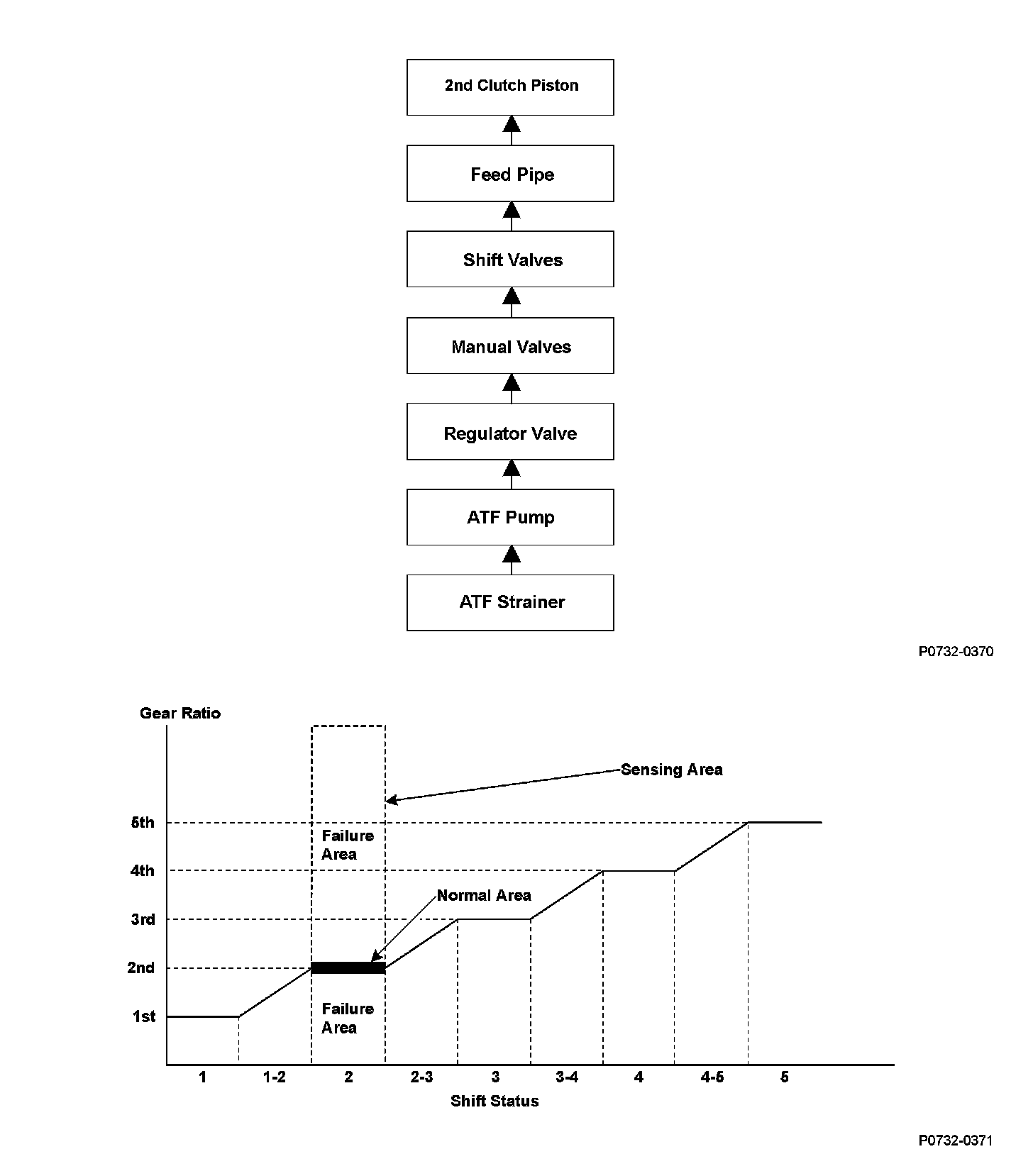 To transmit the 2nd gear driving force, line pressure is supplied to the 2nd clutch piston, the 2nd clutch is engaged, and the secondary shaft and the secondary shaft 2nd gear are connected and revolve together. Hydraulic pressure is supplied to the 2nd clutch through the ATF strainer the ATF pump the regulator valve the manual valve the shift valves the feed pipe 2nd clutch piston. (The shift valve failure in the supplying route above is detected by the malfunction detection of each shift solenoid valve.) The powertrain control module (PCM) computes the ratio of the mainshaft speed to the countershaft speed. When the ratio is not the 2nd gear ratio, it is detected as a malfunction of the hydraulic circuit or the 2nd clutch, and a DTC is stored.