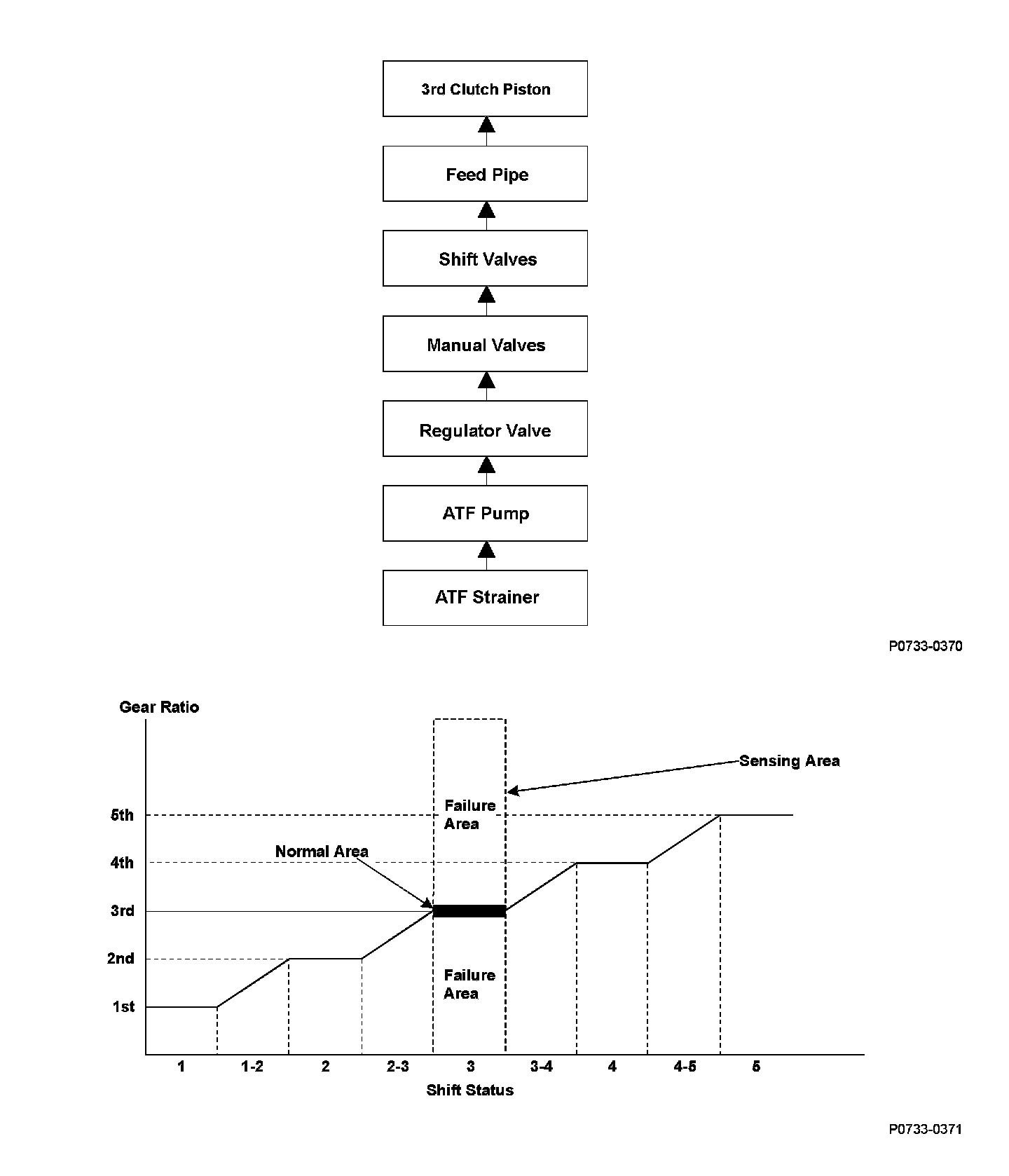 To transmit the 3rd gear driving force, line pressure is supplied to the 3rd clutch piston, the 3rd clutch is engaged, and the secondary shaft and the secondary shaft 3rd gear are connected and revolve together. Hydraulic pressure is supplied to the 3rd clutch through the ATF strainer the ATF pump the regulator valve the manual valve the shift valves the feed pipe 3rd clutch piston. (The shift valve failure in the supplying route above is detected by the malfunction detection of each shift solenoid valve.) The powertrain control module (PCM) computes the ratio of the mainshaft speed to the countershaft speed. When the ratio is not the 3rd gear ratio, it is detected as a malfunction of the hydraulic circuit or the 3rd clutch, and a DTC is stored.