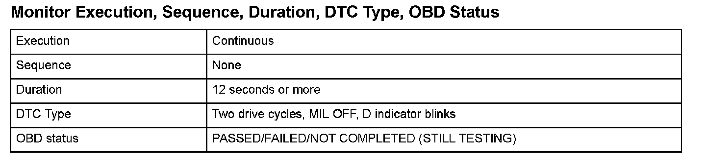 Monitor Execution, Sequence, Duration, DTC Type, OBD Status