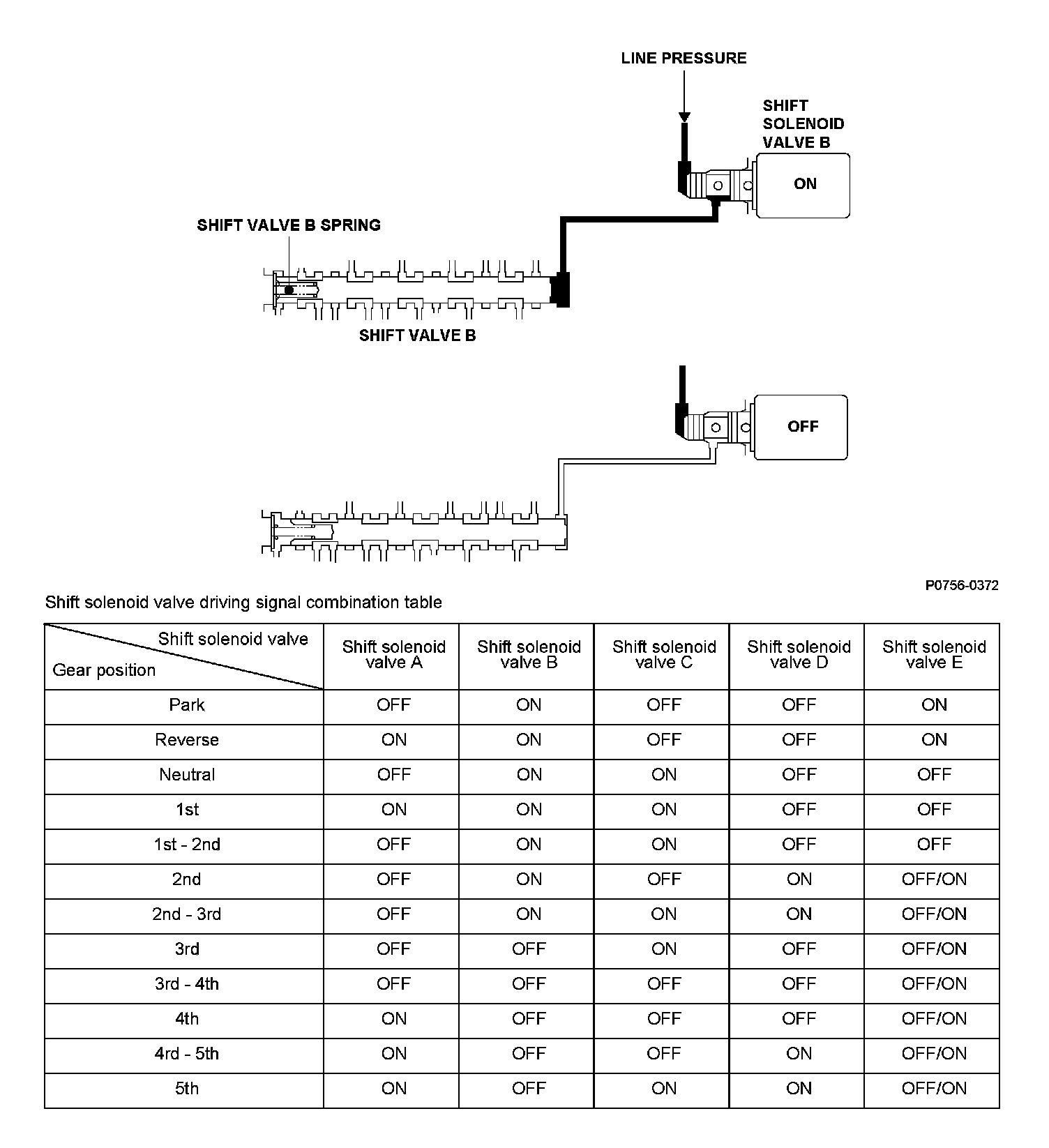 Shift solenoid valve B is installed in the transmission housing. It is controlled by the ON/OFF signal from the powertrain control module (PCM), to apply line pressure to shift valve B. The signal from the PCM is output to apply clutch pressure control pressure to the proper gear change clutch according to the gear change schedule. When the signal to shift solenoid valve B from the PCM is OFF, and line pressure is discharged, shift valve B is inactive. When the signal to shift solenoid valve B from the PCM is ON, and line pressure is applied to the shift valve B, it operates against the shift valve B spring. The PCM monitors the mainshaft speed and the countershaft speed at the gear change determined by the shift schedule. When an improper gear ratio is output compared to the predetermined gear change mode, a shift solenoid valve B OFF failure is detected and a DTC is stored.