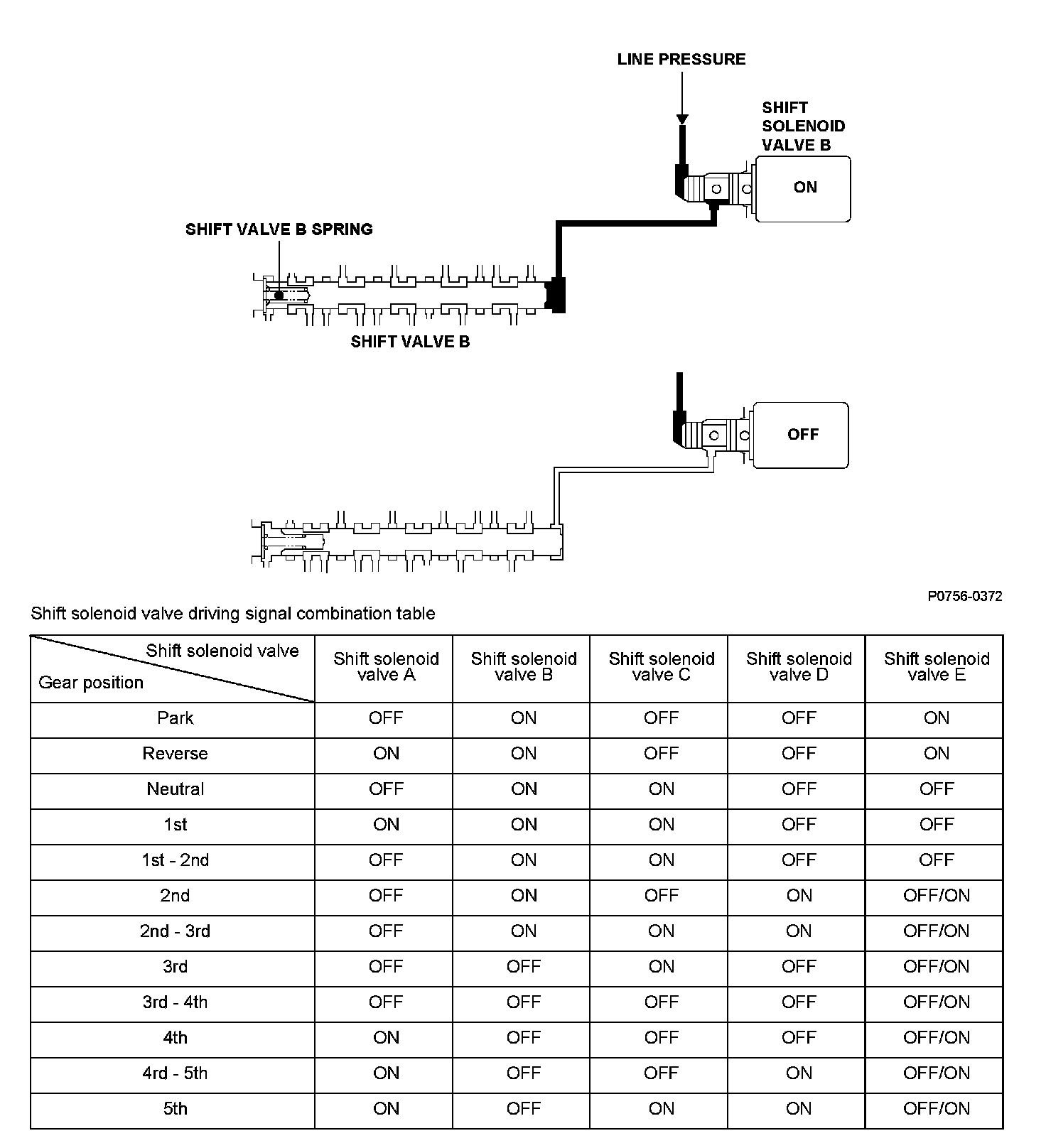 Shift solenoid valve B is installed in the transmission housing. It is controlled by the ON/OFF signal from the powertrain control module (PCM), to apply line pressure to shift valve B. The signal from the PCM is output to apply clutch pressure control pressure to the proper gear change clutch according to the gear change schedule. When the signal to shift solenoid valve B from the PCM is OFF, and line pressure is discharged, shift valve B is inactive. When the signal to shift solenoid valve B from the PCM is ON, and line pressure is applied to shift valve B, it operates against the shift valve B spring. The PCM monitors the mainshaft speed and the countershaft speed at the gear change determined by the shift schedule. When an improper gear ratio is output compared to the predetermined gear change mode, a shift solenoid valve B ON failure is detected and a DTC is stored.