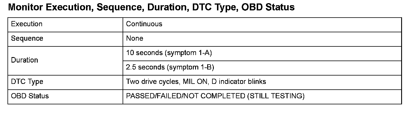 Monitor Execution, Sequence, Duration, DTC Type, OBD Status