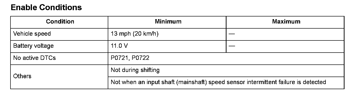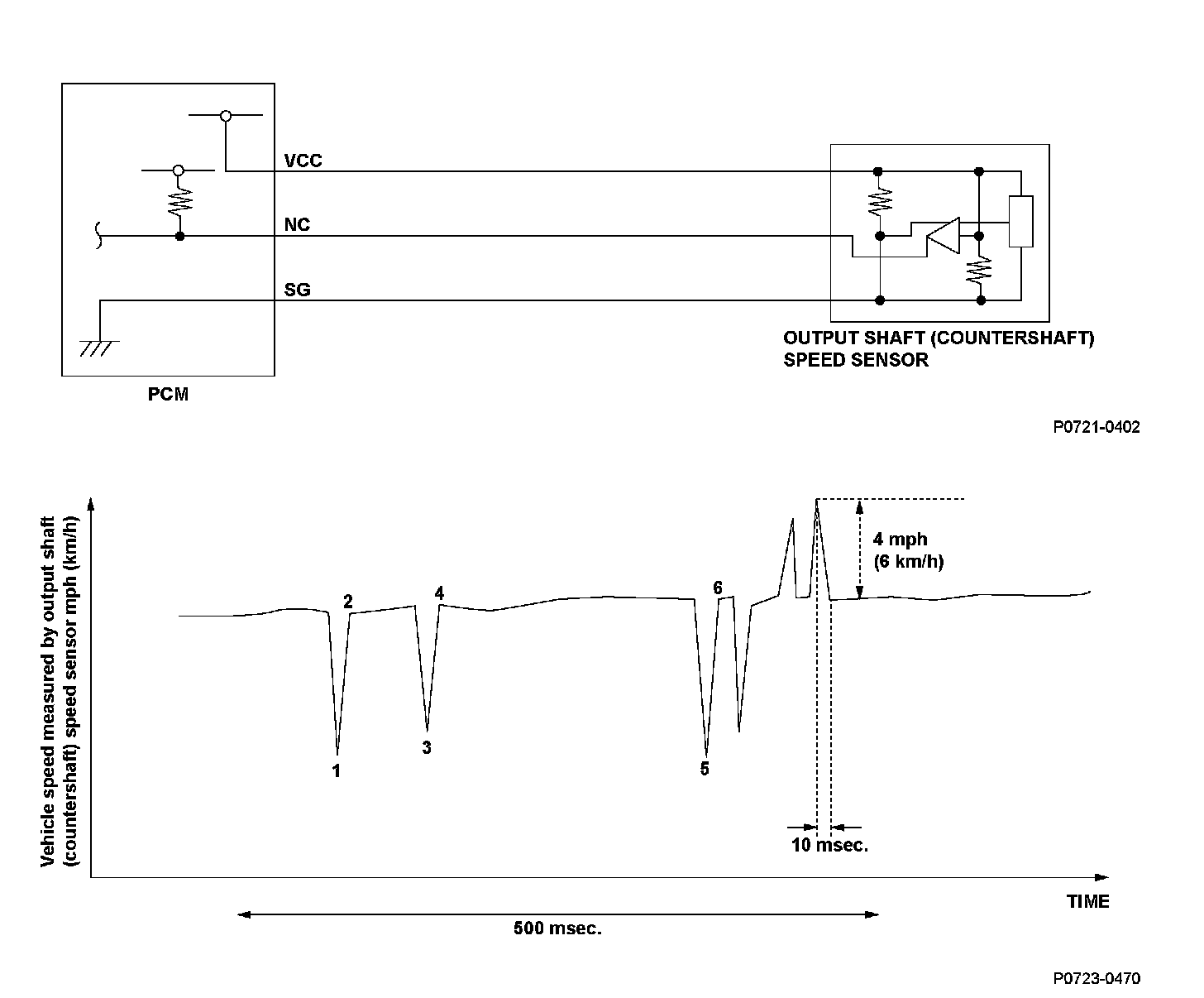 The output shaft (countershaft) speed sensor is attached to the outside of the transmission housing. The output shaft (countershaft) speed sensor generates a pulsing signal according to the speed of the park gear on the countershaft. Using that signal, the powertrain control module (PCM) determines the speed of the countershaft. If pulse dropouts occur with the countershaft rotating, the PCM detects a malfunction that may be caused by an open, a temporary open, or a short to ground. Based on the fluctuation of the vehicle speed measured by the output shaft (countershaft) speed sensor, a malfunction is detected and a DTC is stored.