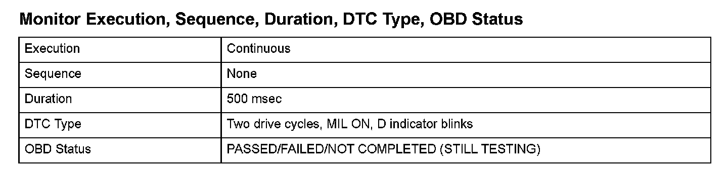 Monitor Execution, Sequence, Duration, DTC Type, OBD Status