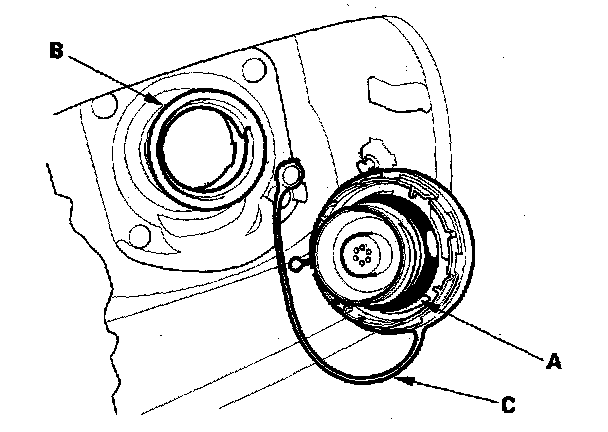 2. Check the fuel fill cap seat (A) and the fuel fill pipe mating surface (B). Verify that the fuel fill cap tether cord (C) is not caught under the cap.