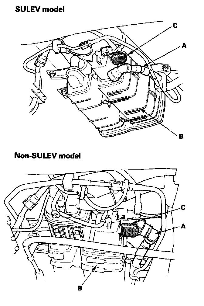 9. Disconnect the fuel tank vapor recirculation tube (A) from the EVAP canister (B), and plug the EVAP canister port (C).