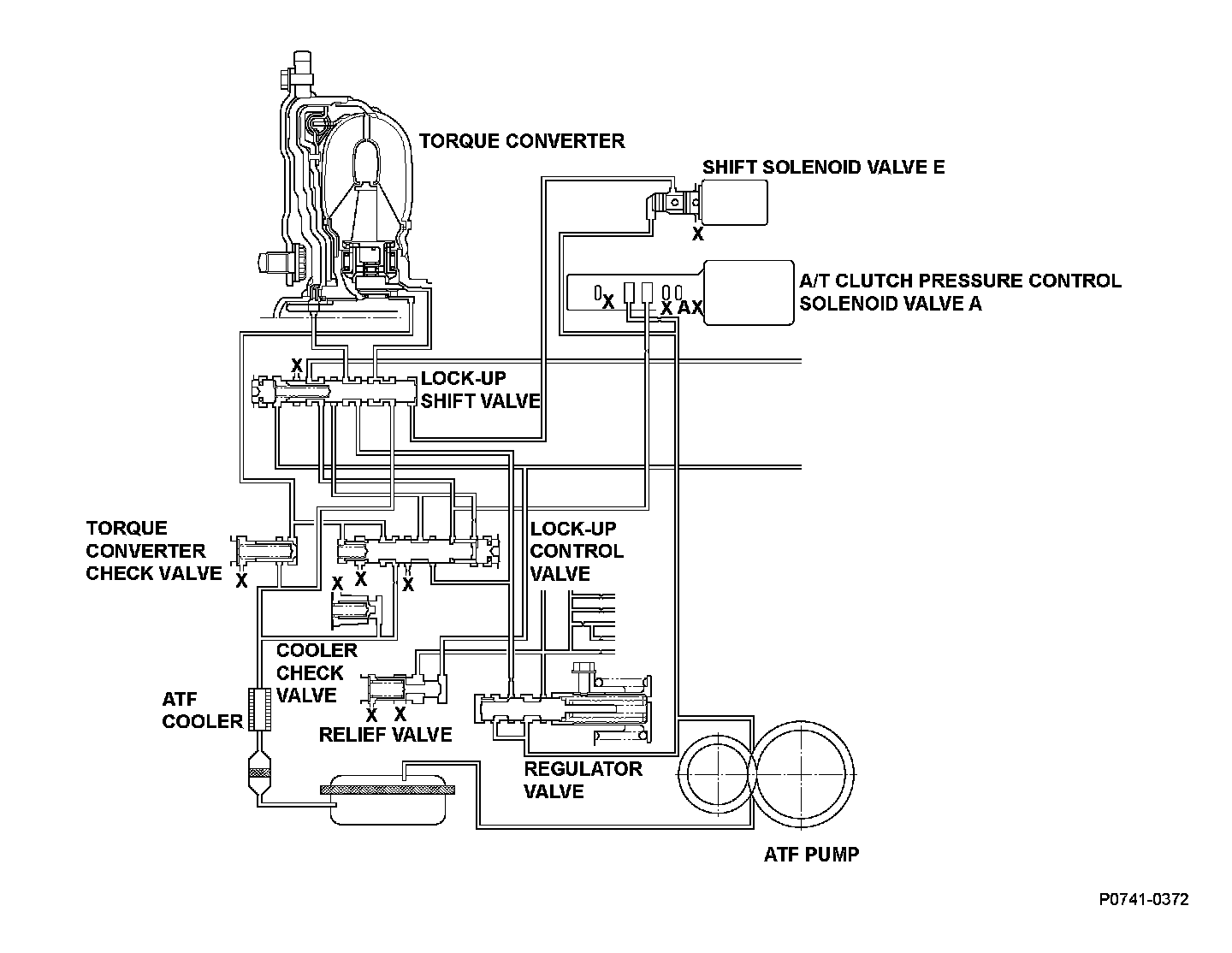 The power transfer capacity of the torque converter clutch is controlled by the balance of automatic transmission fluid (ATF) supply to and discharge from the torque converter. When hydraulic pressure is applied internally, the torque converter clutch turns ON, and when hydraulic pressure is applied from the back pressure side, the lock-up clutch turns OFF. As the hydraulic pressure from the internal pressure side increases, the power transfer capacity of the torque converter clutch increases. The direction of hydraulic pressure supply is switched by shift solenoid valve E and the lock-up shift valve. ATF is supplied from the internal pressure side to shift solenoid valve E when the signal from the powertrain control module (PCM) is ON (12 V), and ATF is supplied from the back pressure side when it is OFF (0 V). The balance of internal pressure and back pressure is controlled by A/T clutch pressure control solenoid valve A and the lock-up control valve. A/T clutch pressure control solenoid valve A maximizes the power transfer capacity of the torque converter clutch when the signal from the PCM is ON (1 A), and it minimizes the power transfer capacity of the torque converter clutch when the signal from the PCM is OFF (0 A). If the ratio of engine speed and mainshaft speed is not about 1:1 while the PCM is issuing the command to turn shift solenoid valve E and A/T clutch pressure control solenoid valve A ON, the PCM detects a faulty lock-up control system and stores a DTC.