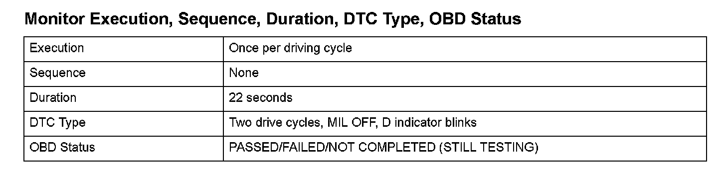 Monitor Execution, Sequence, Duration, DTC Type, OBD Status