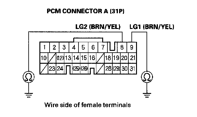 5. Check for continuity between PCM connector terminal A8 and body ground, and between PCM connector terminal A9 and body ground.