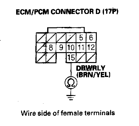 8. Check for continuity between ECM/PCM connector terminal D15 and body ground.