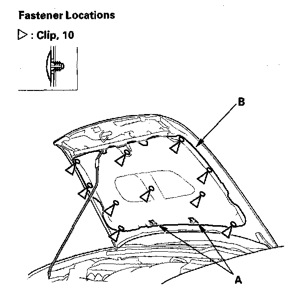 Hood Insulator Replacement1. Using a clip remover, detach the clips. Release the hooks (A), then remove the hood insulator (B). Take care not to scratch the hood.