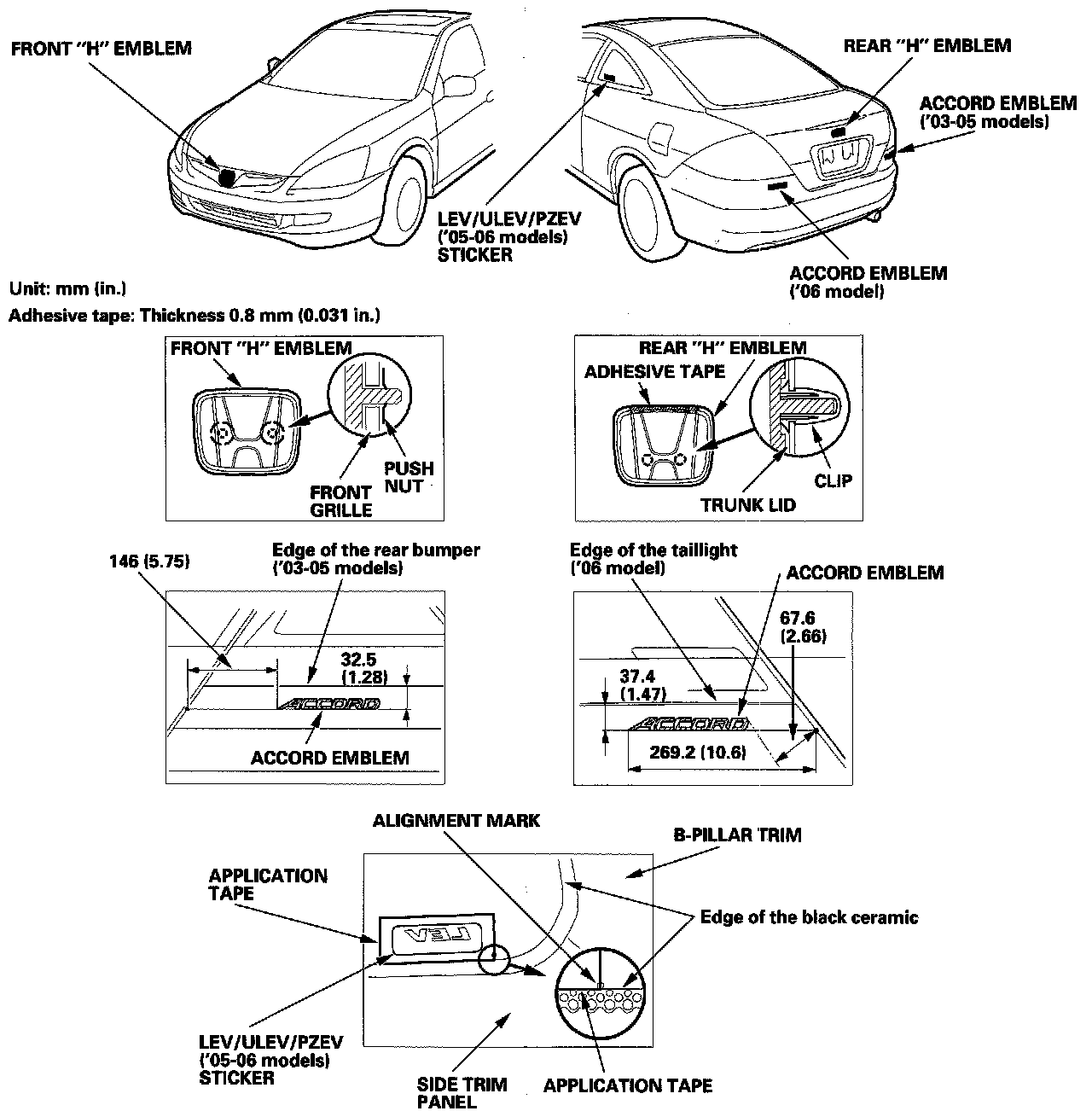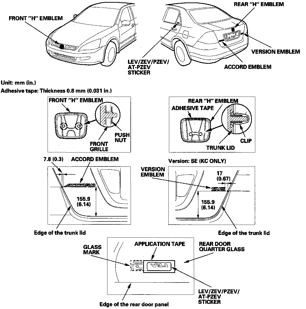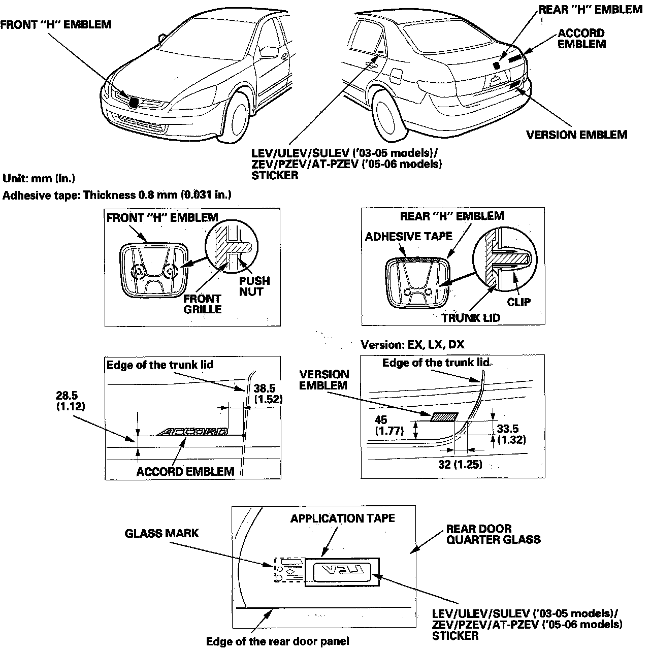 2. Apply the emblems/sticker where shown. When installing the LEV/ULEV/PZEV ('05-06 models) sticker on the inside surface of the quarter glass, align the sticker application tape with the edge of the black ceramic and the alignment mark on the quarter glass, then press the sticker into place, and remove the application tape.