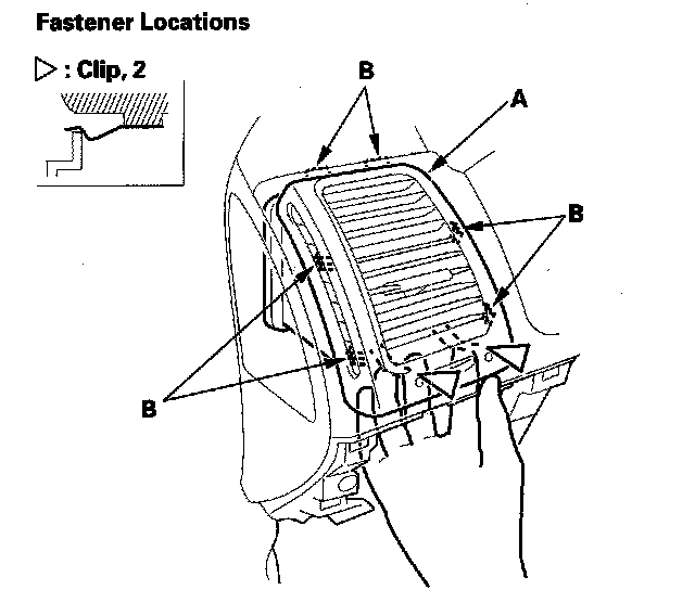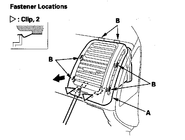 3. Pull out along the edge of the passenger's side vent (A) by hand to release the lower clips and the upper and side tabs (B). Then remove the vent.
