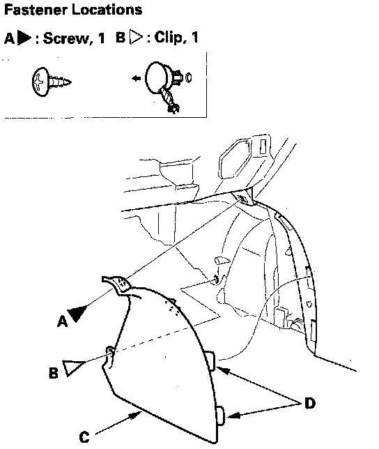 4. Remove the screw (A) and release the clip (B), then remove the driver's center lower cover (C) by releasing the hooks (D).