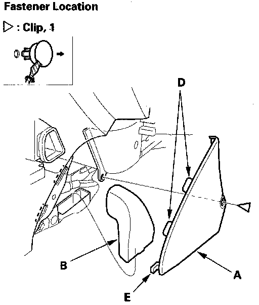 5. Release the clip, then remove the passenger's center lower cover (A) and the rear vent duct (B) by releasing the hooks (D) and the hook (E) ('04-06 models).
