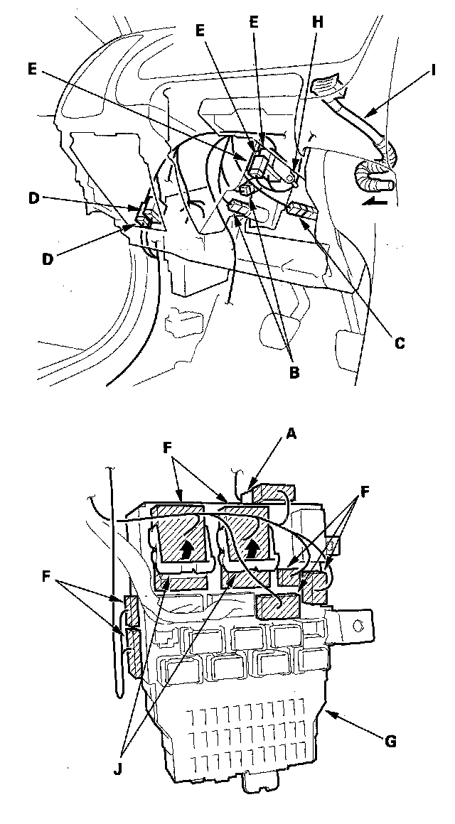 NOTE: Lift the white wire harness connector locks (J) before trying to remove the connectors from the fuse box.