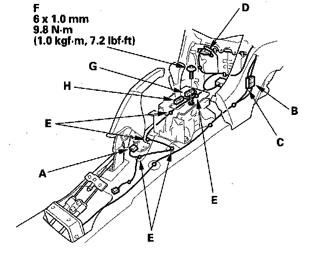 Using a T30 Torx bit, remove the ground bolt (F). On A/T model, disconnect the parking pin switch connector (G) and shift lock solenoid connector (H).