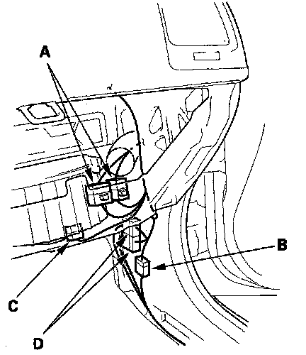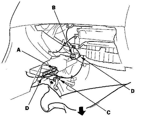 9. From under the dash, disconnect the ECM/PCM connector (A), power transistor connector (B), and engine wire harness connector (C), then release the wire harness clips (D).