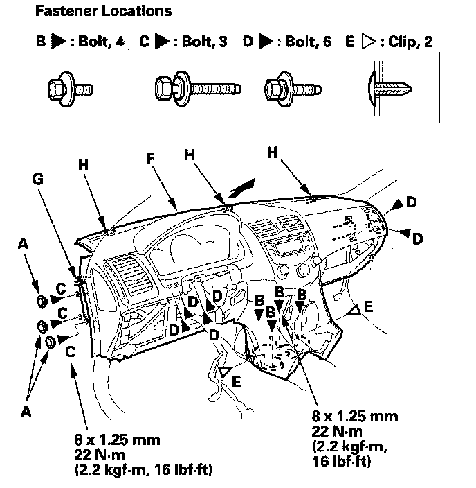 14. Open the driver's door, and remove the caps (A), then remove the bolts (B, C, D), and clips (E) and lift up on the dashboard (F)/steering hanger beam to release it from the guide pins (G, H).