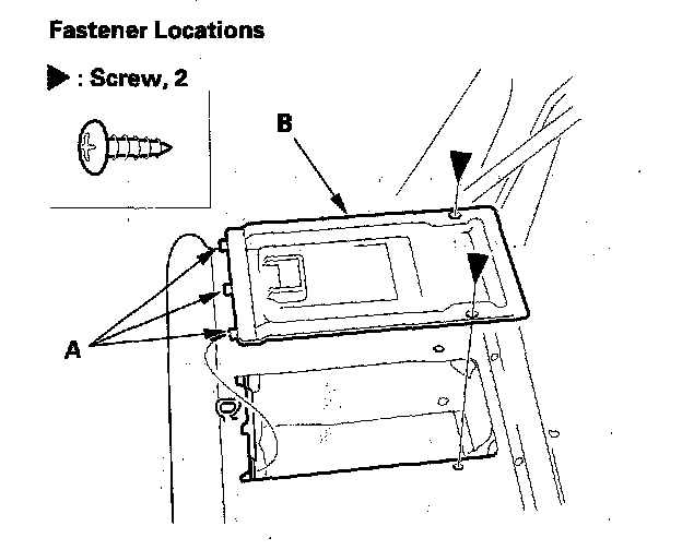 5. Remove the screws, and detach the hooks (A), then remove the trunk pass-through cover (B).